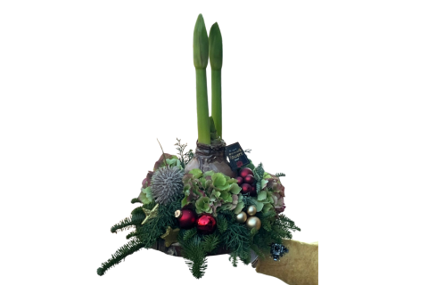 Dieses Arrangement aus Amaryllis, edlen Hortensien und Tannenzweigen bringen warmen Zauber in jeden Raum.